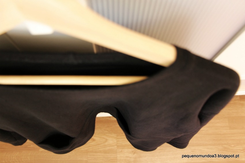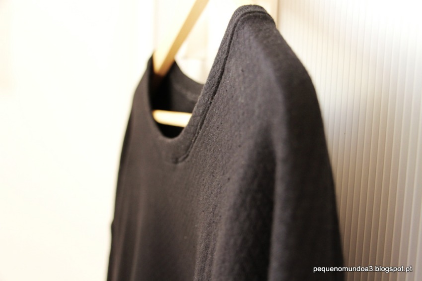 A única coisa que fiz diferente foi a gola que usei uma tira de rib rosa que comprei na Nosh  e cosi como se fosse uma fita de viés com a diferença que finalizei a costura por dentro à mão. Assim não se nota o ponto por fora e dá para fazer um lindo laço rosa que corta o preto-e-branco. Também deixei as mangas sem costura final, ficavam demasiado giras dobradas a ver-se o interior branco e fofo para eu ter mais trabalho :-)