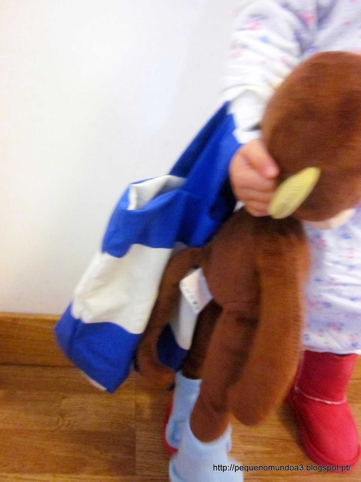 Miss Caracolinhos no seu delicado pijama e botas rosa choque (escolhidas por ela! a sério eu dei-lhe a hipótese de escolher as castanhas!) açambarcou a mala e fizemos uma sessão de fotos com o macaco de meias. ( sim, o macaco tem frio nos pés :-) ...)