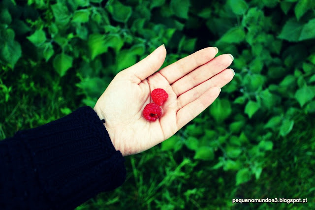 Parece incrível como coisas tão simples como apanhar umas framboesas (poucas mesmo que a planta é nova e tem pouco juízo), estender uma manta num pedacinho de relva para contar as nuvens e apanhar banhos de sombra com a pequena mais velha, ver quantos girassóis já abriram ou mesmo inspecionar os fisális pela 34506125413 vez para ver se já está algum maduro, podem trazer tanta alegria a esta mulher.